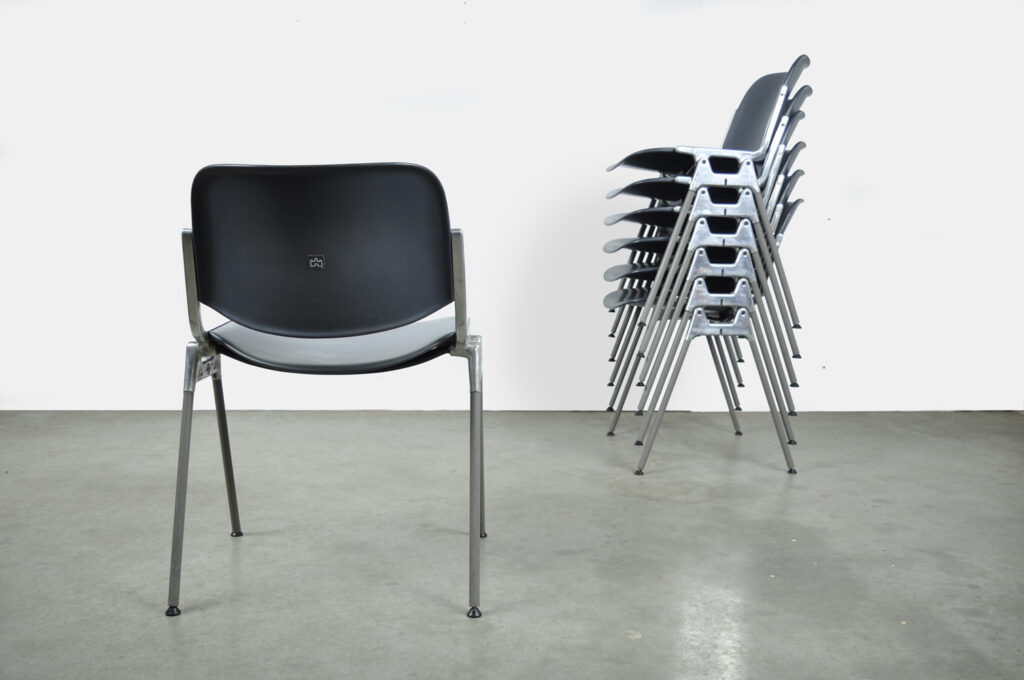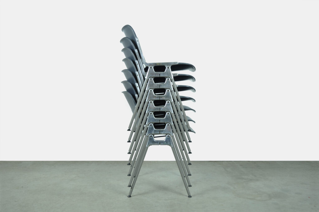 Design chairs, type DSC Axis 106, designed in the 1960s by Giancarlo Piretti for Castelli, Italy. The 7 chairs have a blue-grey plastic upholstery, aluminum frame, steel legs with gray plastic sleeves and black plastic feet. Good vintage condition. The frame is neat and has minimal damage (due to stacking). Light signs of wear on the plastic seats and backrests. 1 plastic leg sleeve has minor damage.