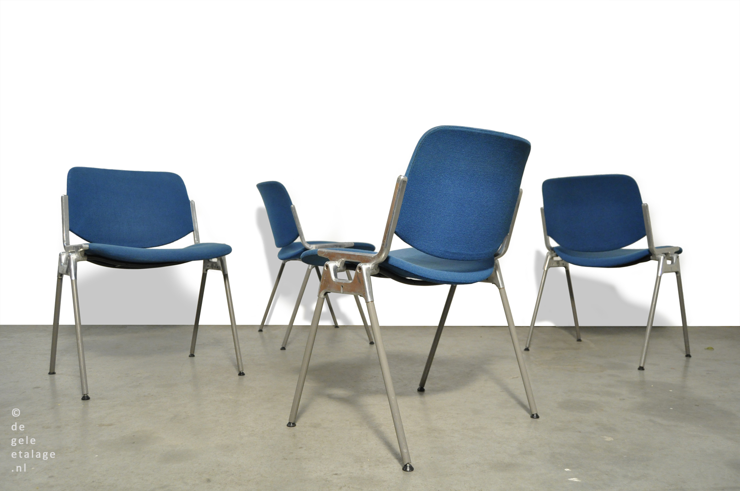 design chairs, type DSC Axis 106, designed in the 1960s by Giancarlo Piretti for Castelli, Italy. The chairs have a blue melange fabric upholstery, aluminum frame, steel legs with gray plastic sleeves and metal feet. Good vintage condition. The frame is neat and has minimal damage (due to stacking). The upholstery has a slight discolouration on the top of the backrests. Seats are not spotless.