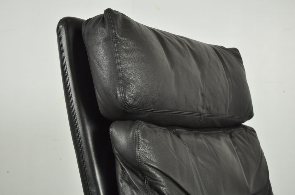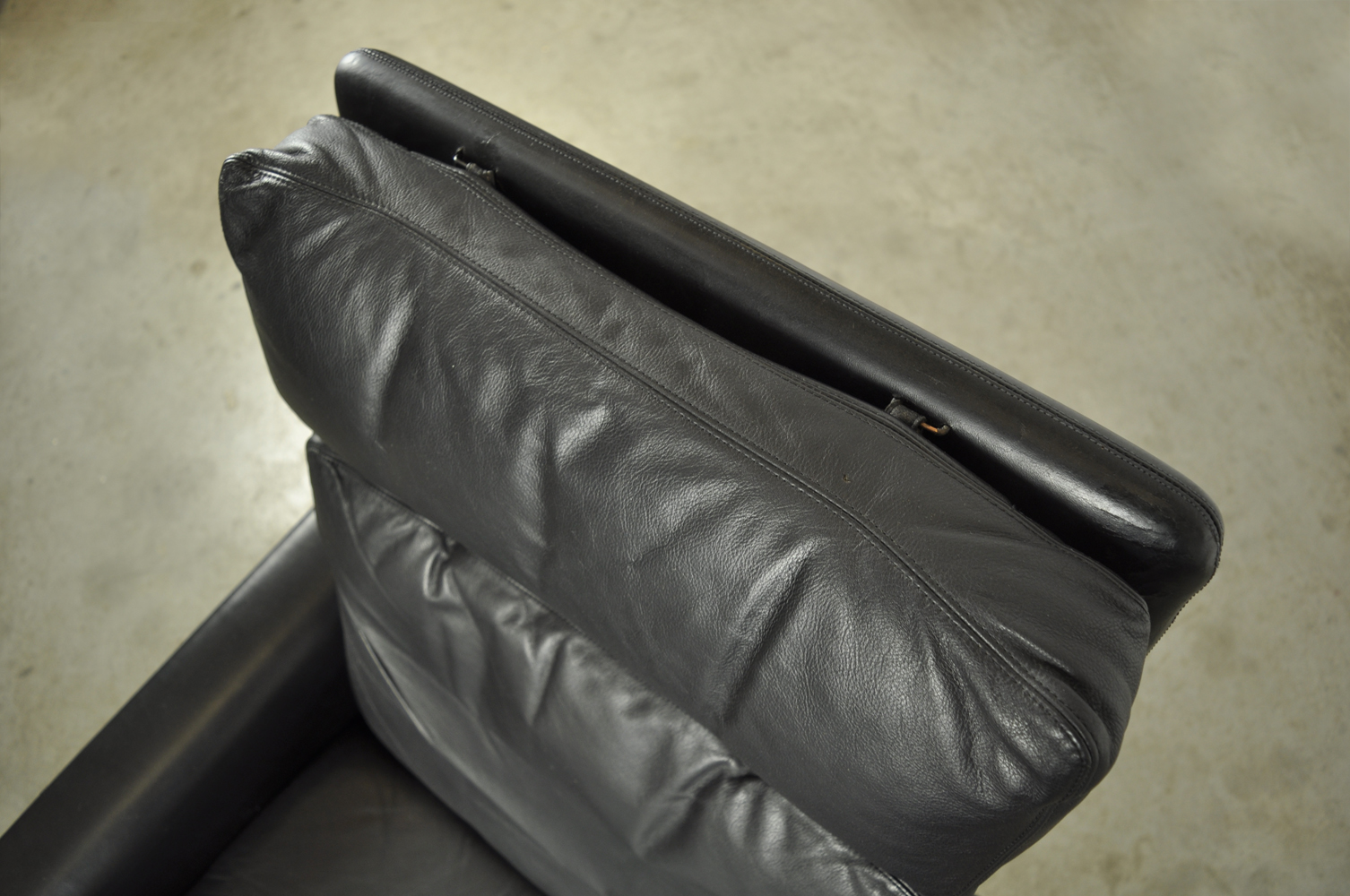 classic vintage armchair (high model) designed by Hans Olsen and produced by CS Møbler Glostrup, 1960s. Beautiful black leather men’s armchair standing on square teak wooden legs. The armchair has a loose leather back, head and seat cushion, where the back and the head cushion are held in place with straps. Timeless Danish design. Good vintage condtion. Small repair at one leg.