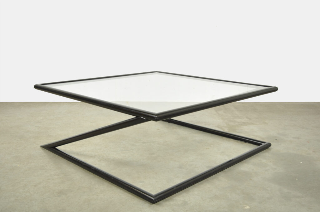 Post modern coffee table, model Z, by the Dutch furniture maker Harvink, 80. The table has a powerful architecturally designed frame of black metal round tubes with a hard glass plate on top. Good vintage condition. Glass plate is intact. The frame has some light damage/stripes at the bottom (see photo).