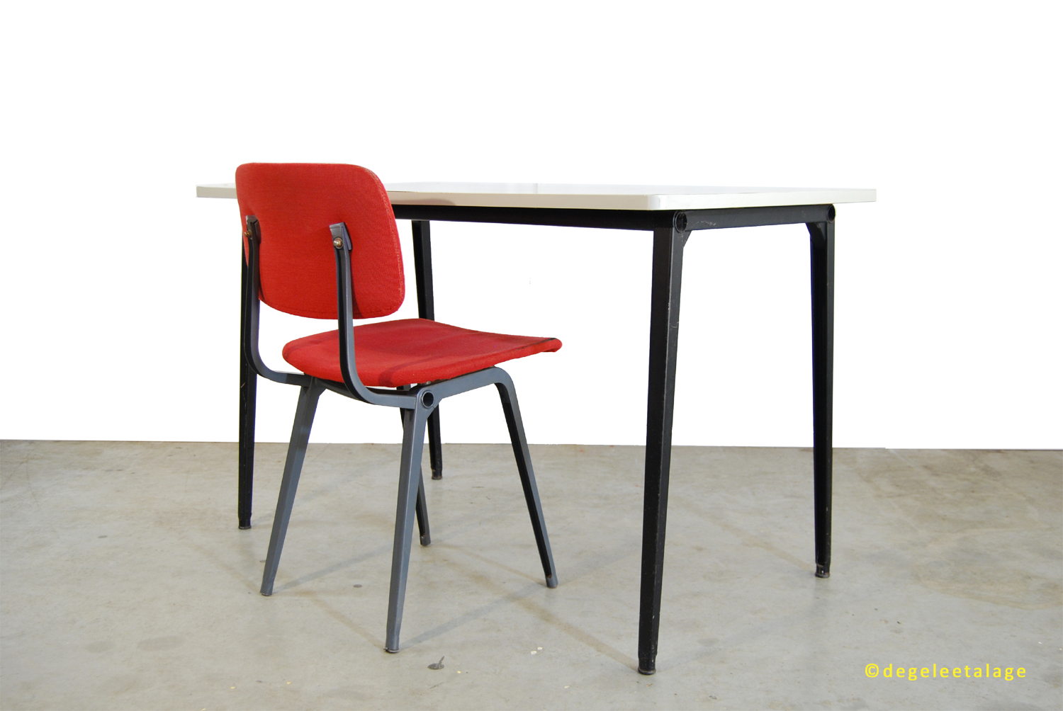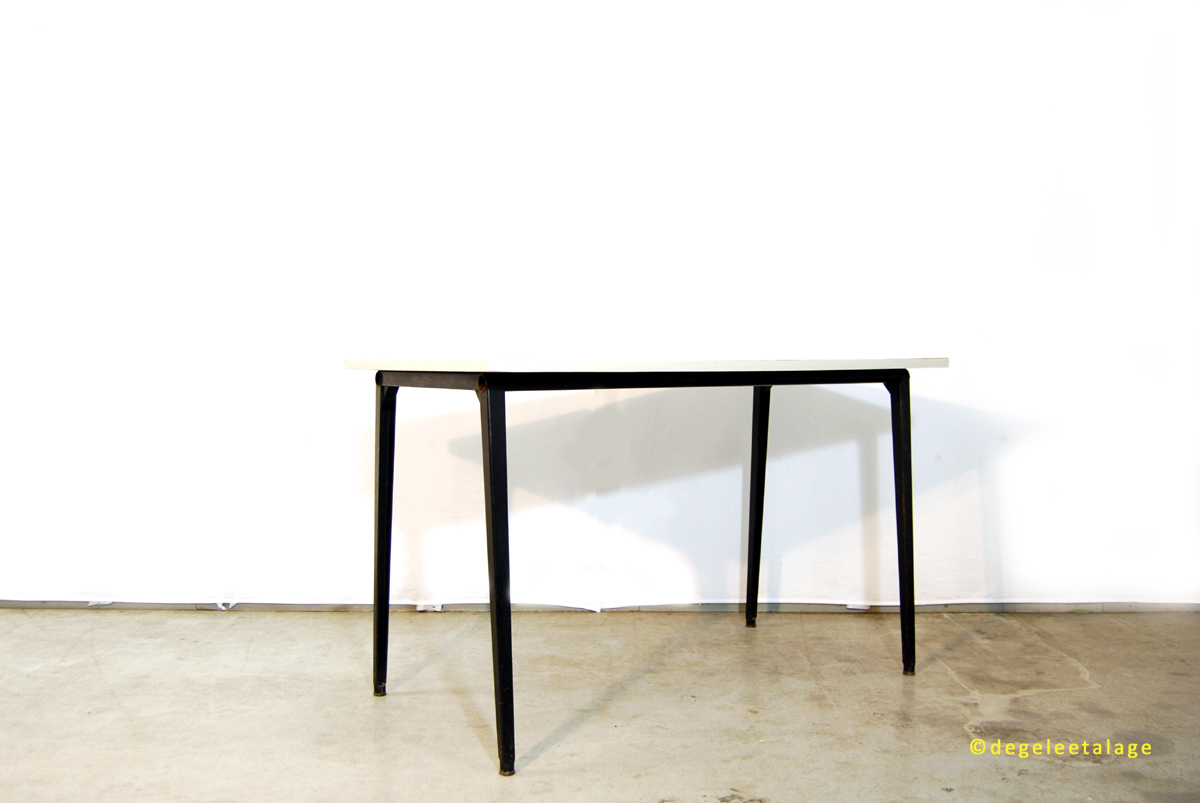 Industrial table, black frame and white/grey formica top. The REFORM table is designed by Friso Kramer for Ahrend de Cirkel, 1964 in the same style as the REVOLT chair. In good used condition. Frame some wear and very little usermarks on the top. Some little enlargement at the edge (see photo’s)(exclusive chairs)