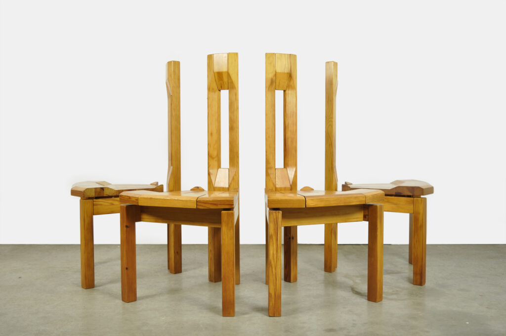 Zeldzame Finse brutalist eettafelstoelen, model “Rantasipi” (strandloper) ontworpen door Arnold Lerber en geproduceerd door Laukaan Puu, 1970s. De sculpturele stoel bestaat uit massief dennenhout (zilverspar of -den) met een mooie tekening. Stoere robuuste, maar toch sierlijke brutalist stoelen met bijzondere details. Een ware aanwinst voor uw mid-century of contempary interieur. De stoelen zijn allen gebrandmerkt. Goede tot zeer goede vintage conditie. Gebruikssporen overeenkomstig de leeftijd. Bij een stoel heeft een reparatie plaatsgevonden. Het houtwerk wijkt hier iets af van kleur.