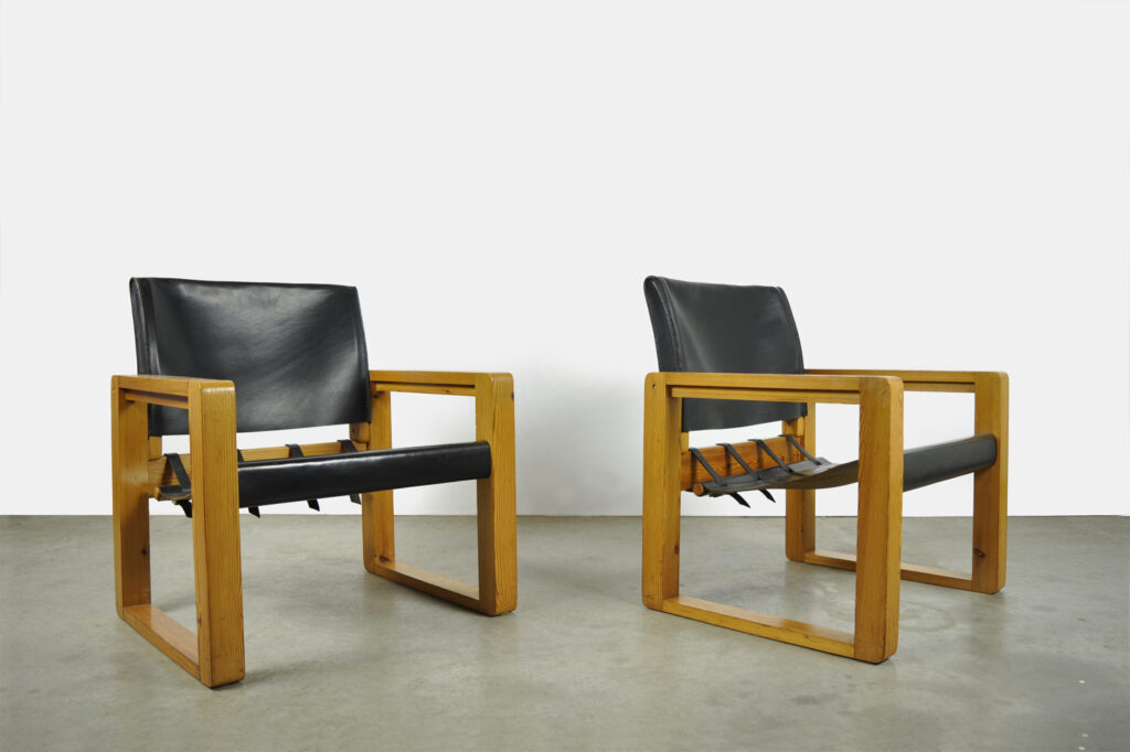 Vintage Scandinavische safari easy fauteuils, 1970s. De stoere fauteuils hebben een massief vurenhouten frame waartussen de zwarte zadelleren zitting is gespannen. De leren rugleuning is over een frame geschoven. De leren riemen aan de achterzijde van de zitting geven de stoelen een mooi robuust karakter. De stoelen hebben een grote gelijkenis met de Karin Mobring Diana safari stoel voor Ikea, maar hebben een ander vorm van het houten frame. Wellicht prototypes of vakmanschap? Zeker is dat dit model zeldzaam is, misschien wel one of a kind. Ontwerper en producent bij ons onbekend. Goede vintage conditie. Lichte gebruikssporen op het houten frame en leer overeenkomstig de leeftijd. Mooie patina