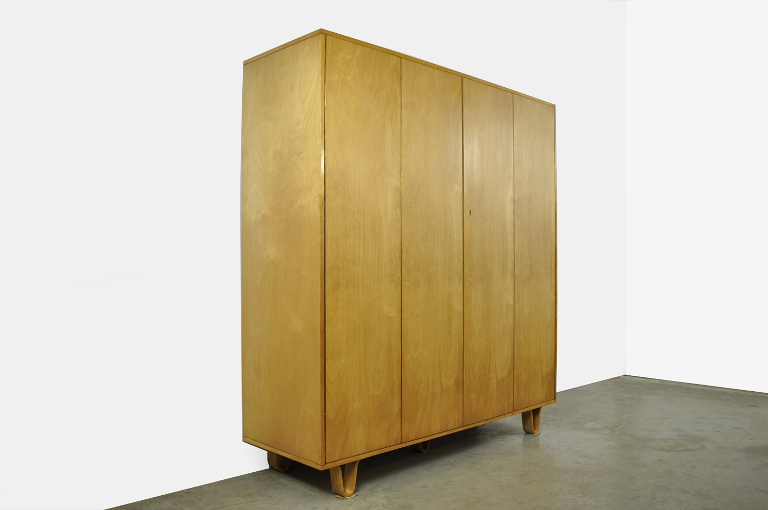Vintage wardrobe KB04, Birch/Combex series, by Cees Braakman for Pastoe, 1950s / Mid-century design Kledingkast KB04 uit de beroemde Berken- Combexseries ontworpen door Cees Braakman voor UMS Pastoe, 1950. Grote berkenfineer cabinet met 4 vouwdeuren, hangrail, aflegplanken, sokkenlade, spiegel en stropdasbakje. Modern en strak uiterlijk met minimale aansluitingen en karakteristieke sierlijke luspoten. De kast is van eerste eigenaar en voor transport volledig demontabel.
