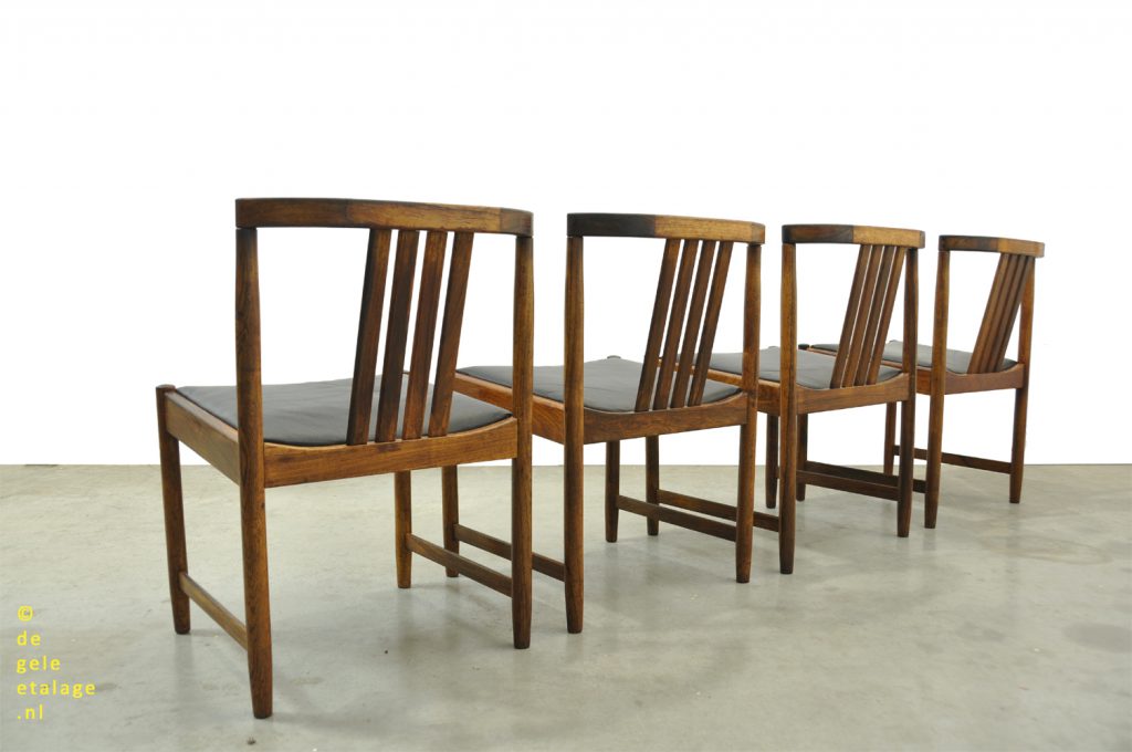 Beautiful set of four rare Rosewood dining table chairs attributed to Illum Wikkelsø, Denmark 1960s. Modern Scandinavian chairs with an art deco look. The black leather seats are of a good quality. Very good vintage condition. The backrest of one of the seats has been repaired (see photo).