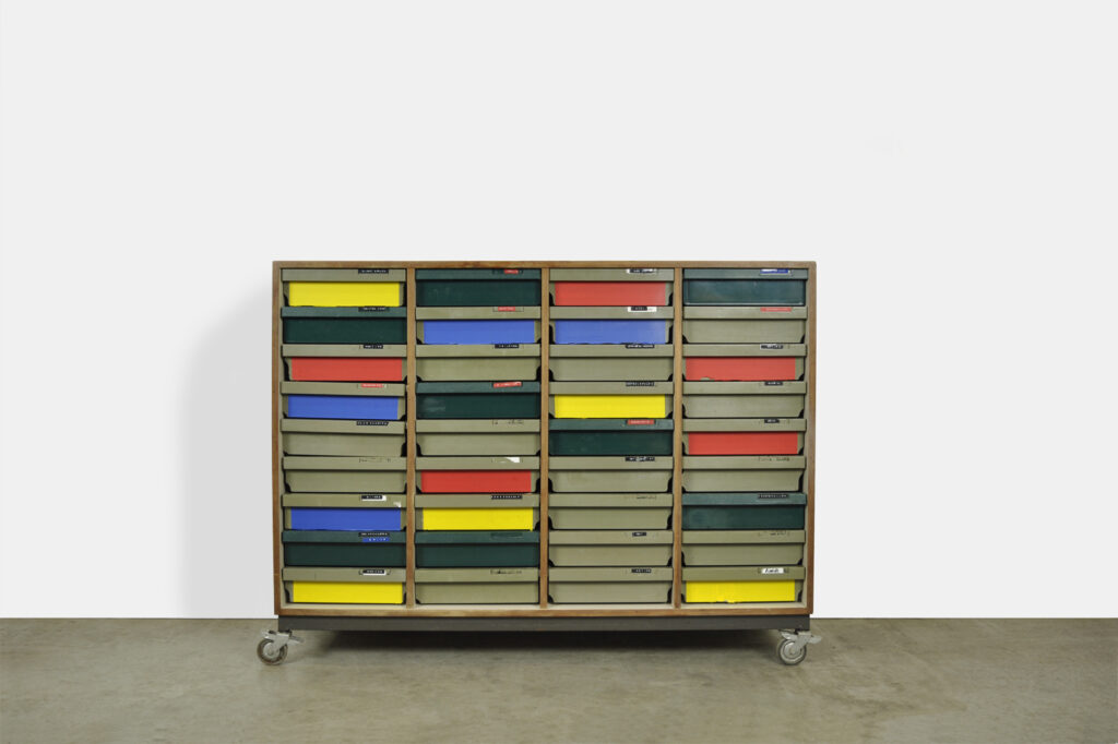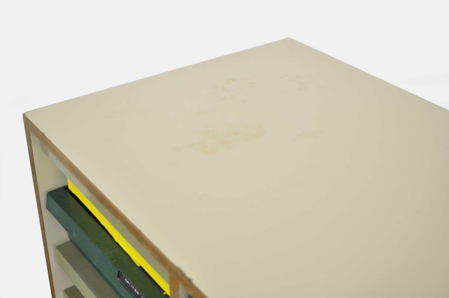 Large school cupboard on wheels and with drawers, 1970s. The cabinet has a wooden frame finished with off-white HPL (plastic laminate covering). The bottom consists of a steel frame with mobile wheels. The cabinet is divided into four surfaces containing drawers (29.5(w)x40(d)x8(h) cm) that can be easily extended. Nice colorful cabinet for storing craft supplies, drawings and paper. Good vintage condition. Signs of use according to age (see also photos). The hpl laminate is slightly loose on 1 of the top corners.