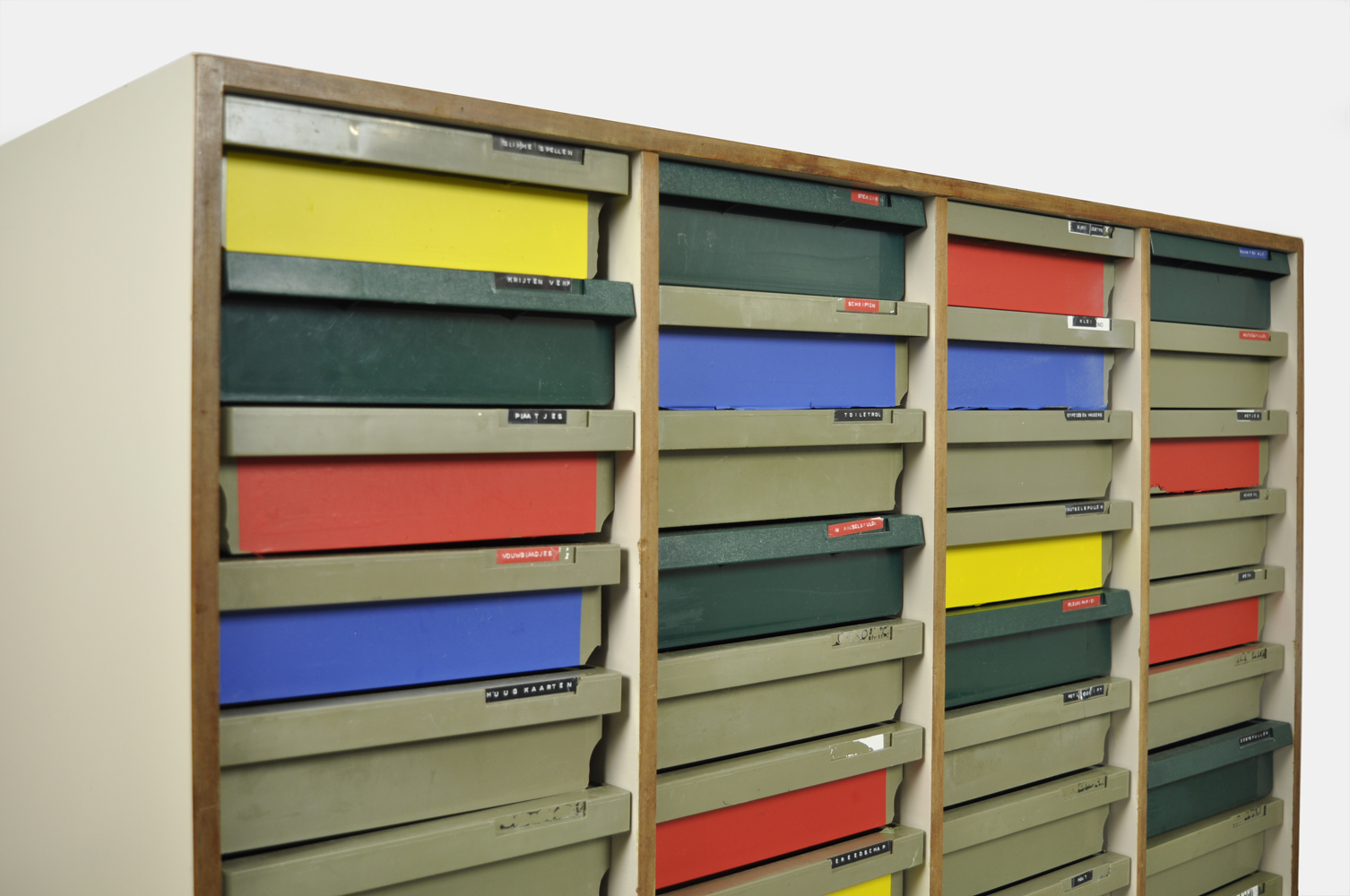 Dutch schoolcabinet with coloured drawers, 1970s / grote schoolkast op wielen en met lades, 1979s. De kast heeft een houtenframe afgewerkt met gebroken wit HPL (kunststof laminaat bekleding). De bodem bestaat uit een stalen frame met verrijdbare wielen. De kast is verdeeld in vier vlakken met daarin schuiflades (29,5(b)x40(d)x8(h) cm) die er makkelijk uitgeschoven kunnen worden. Leuke kleurrijke kast voor het bewaren van de knutselspullen, tekeningen en papier.
