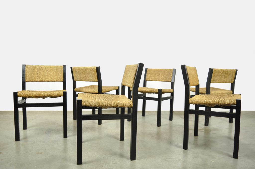 Set of 6 dining chairs with wicker seats by Martin Visser and produced by ‘t Spectrum, 1970s / set van 6 eettafelstoelen ontworpen door Martin Visser en geproduceerd door ‘t Spectrum, 1970s. De stoelen hebben een zwart gebeitst houten frame (origineel) en een zitting en rugleuning van riet. Het model SE82 is in de ontworpen door Martin Visser i.s.m. Walter Antonis voor de Spectrum collectie 1960-1974. De stoelen zijn gemerkt.