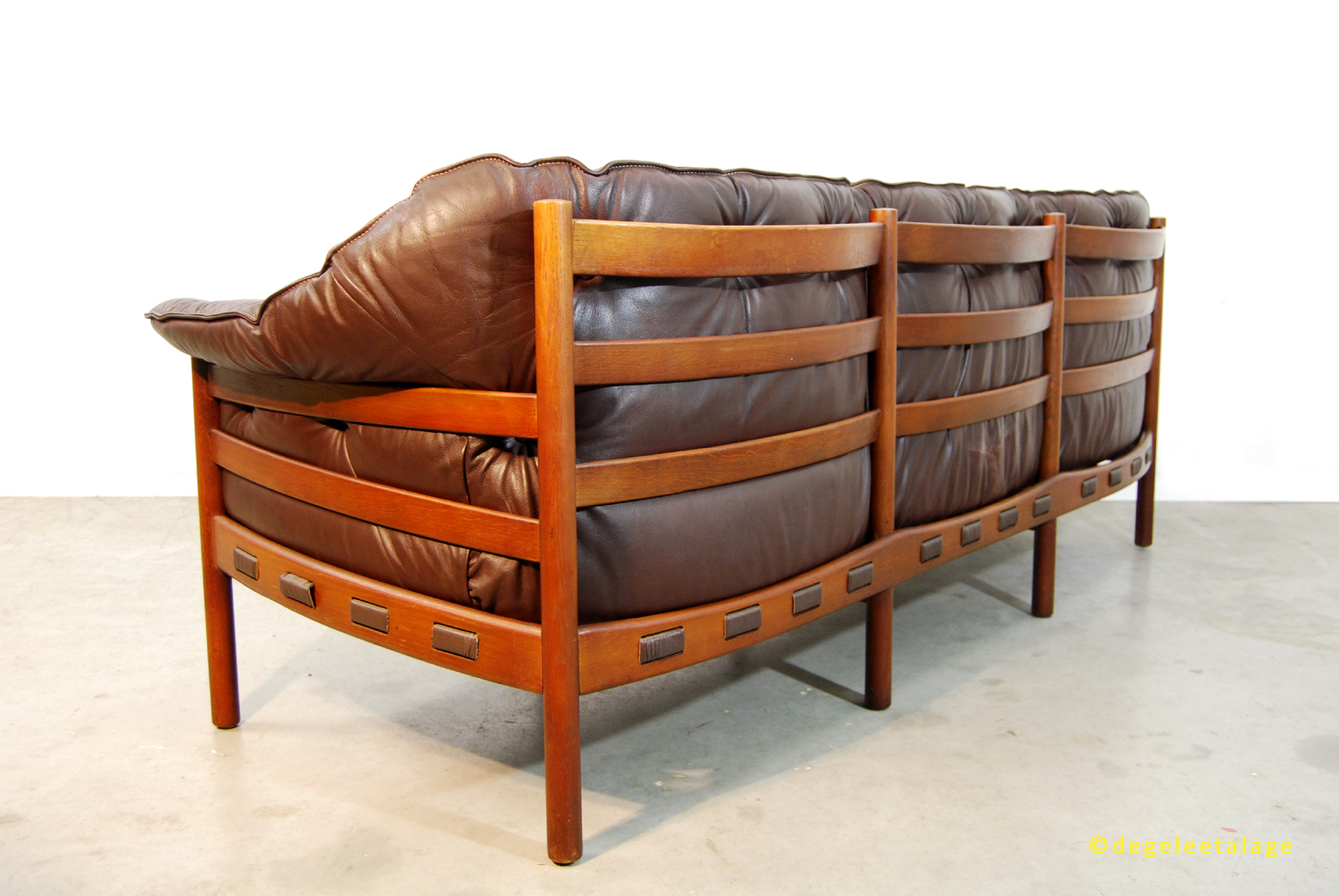Elegant en tegelijk stoere teakhouten design bank met bruin leren bekleding en 3 losse kussentjes. De safari bank heeft mooie gebogen arm- en rugleuning en staat op 8 poten. Het ontwerp van sofa type 925 is van Arne Norell (Zweedse designer 1917-1971) voor Coja Culemborg Nederland, 1960s.