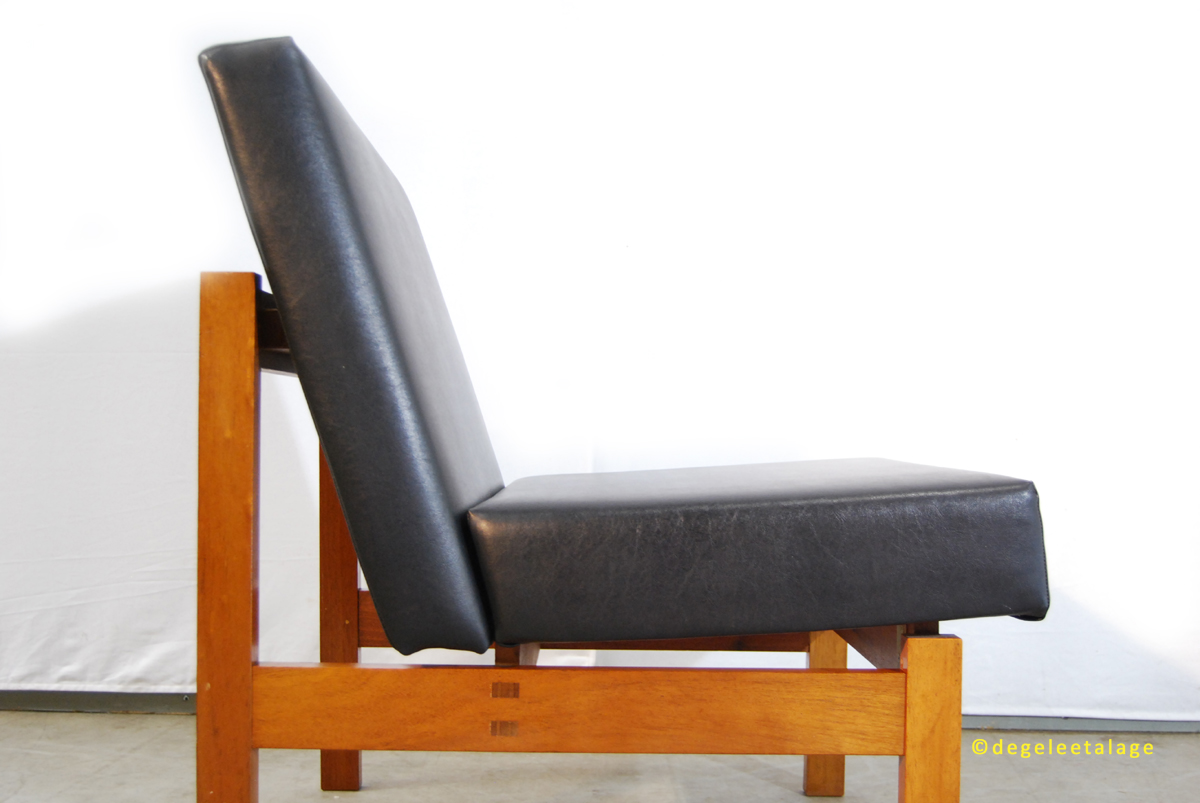 Bijzondere modern vormgegeven design fauteuil met houten frame en zwart skai leren bekleding. De fauteuil is in januari 1972 gefabriceerd door the Thomas Glenister Company in Wycombe / Engeland. Fauteuil is gemerkt.
