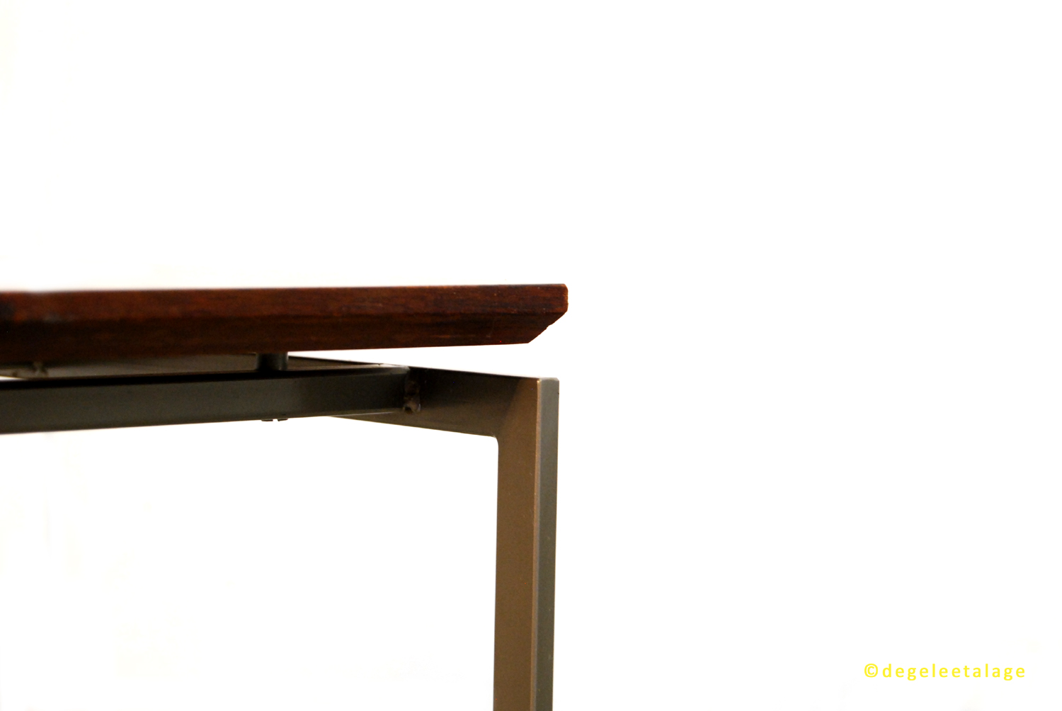 Twee vierkante bijzettafeltjes / mimiset van teakhoutfineer en strak metalen frame. De minimalistische bijzettafeltjes zouden ontworpen kunnen zijn door Cees Braakman voor UMS Pastoe, 1960’s. Conditie: redelijk tot goed. Op de hoekjes enkele kleine beschadigingen aan het fineer.